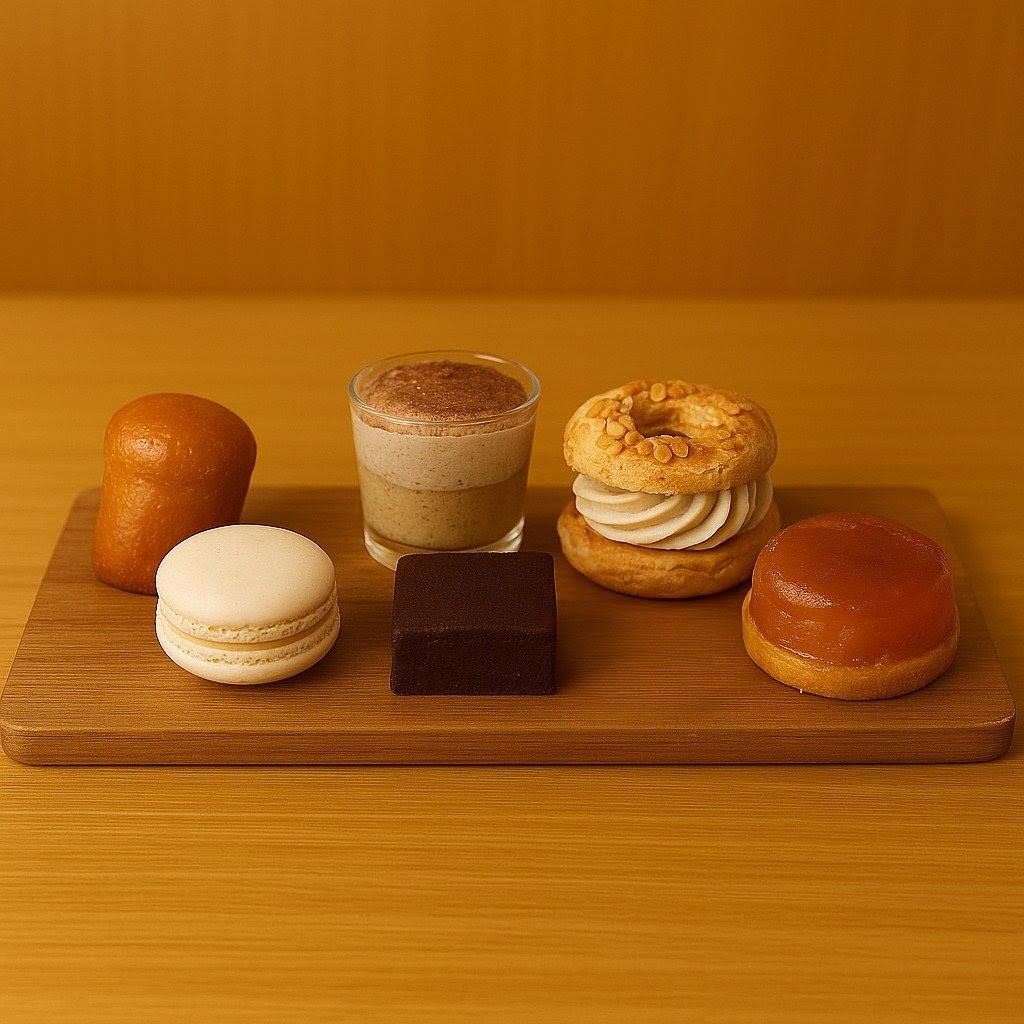 Baba au rhum, Macaron chocolat blanc, tiramisu châtaigne, pavé chocolat à la fève de